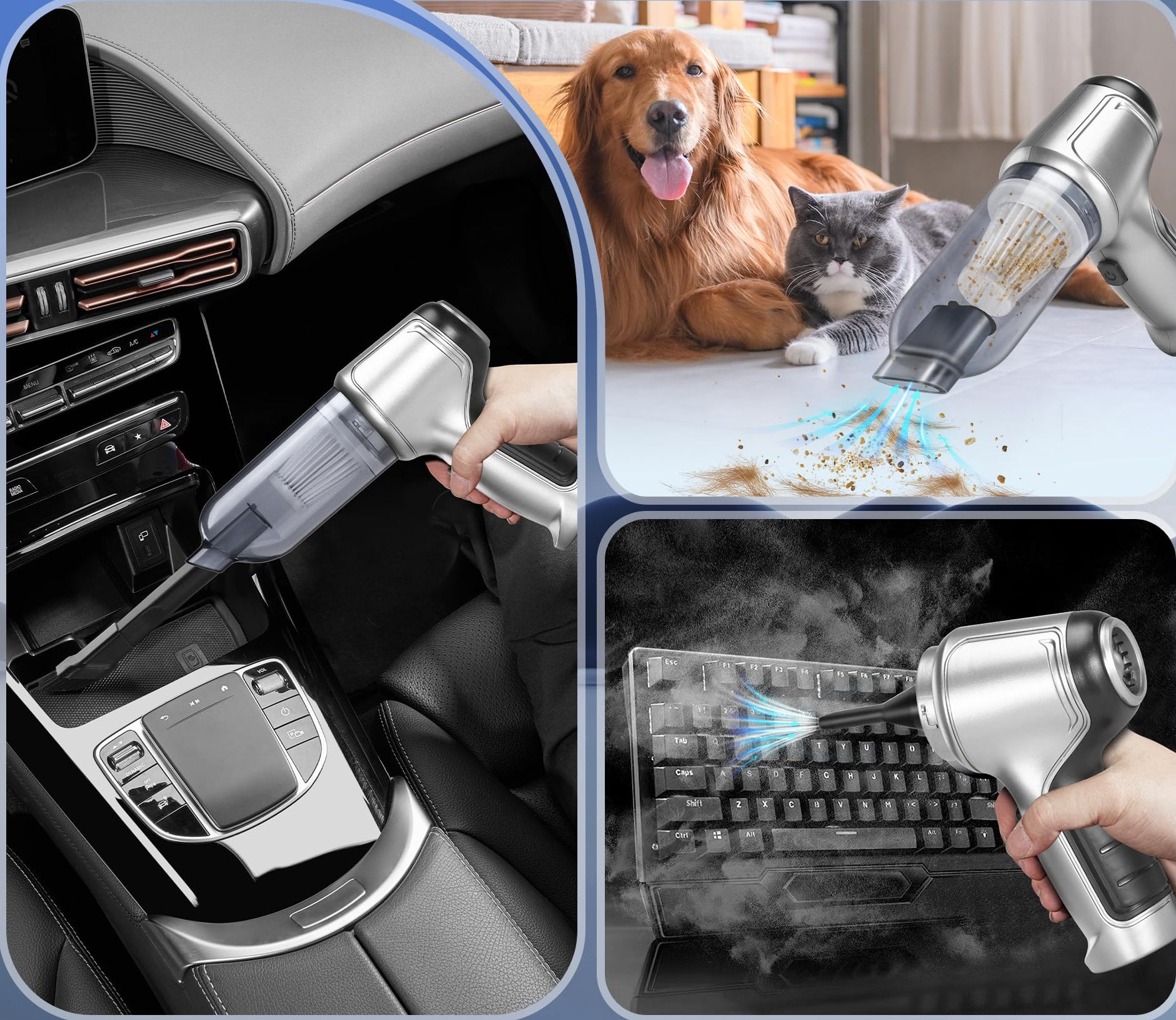 Son moteur superpuissant de 120W fournit une forte aspiration de 5500 Pa, ce qui peut éliminer rapidement et facilement les résidus alimentaires, les particules et les poils d'animaux dans la maison ou dans la voiture